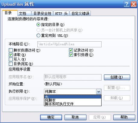 在新開的屬性窗口中選擇執行權限為”無”并點擊確定,這樣就指定該目錄不進行任何的腳本映射和文件執行。