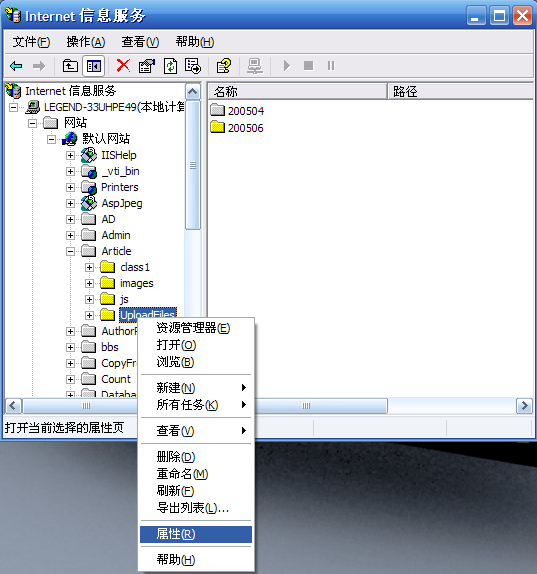 首先,打開IIS并找到上傳文件的目錄,并按右鍵,選擇屬性欄
