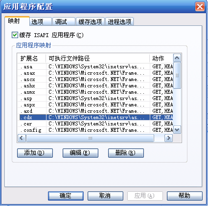 在新開的配置窗口中,我們可以看到各種后綴名,這些都是IIS可以執行的文件名稱后綴,名稱后面的欄目中說明了這種類型的文件,會由那個組件來解析執行它。