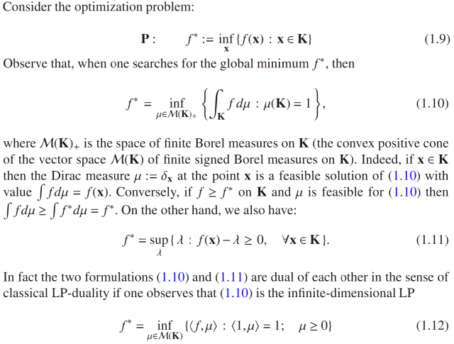 最后,只需要引入無窮多個變量,幾乎所有的數學規劃問題都可以表示成凸優化問題!思路也非常簡單直接,就是把約束域內的點換成對應的Borel概率密度函數,很自然的,目標函數和約束條件都可以寫成概率密度函數的線性積分,也就是凸的。這就把問題變換成了求最優的概率密度函數,無窮多個變量,而其對偶問題則有無窮多個約束!例子見下圖 [2]