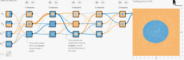 是關于橫坐標值的“拋物線”信息。你也可以給更多關于這個點的信息。給的越多,越容易被分開。連接線:表示權重,藍色表示用神經元的原始輸出,黃色表示用負輸出。深淺表示權重的絕對值大小。鼠標放在線上可以看到具體值。也可以更改。在(1)中,當把