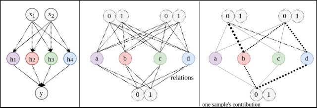 連接的其他變體進行確定。這樣就使得原本需要8個不同數據才能訓練好的關聯變成只需要3,4不同數據個就可以訓練好。(下圖關系線的粗細并非表示權重絕對值,而是共用度)