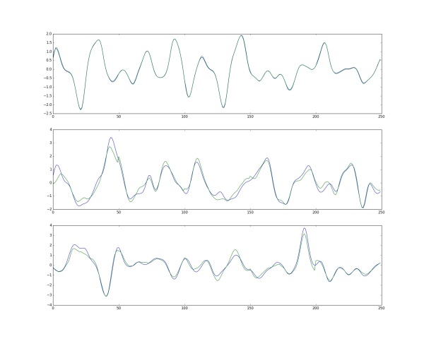 預測新值:訓練過所有樣本后,打亂樣本順序再次訓練若干次。訓練完畢后,當再來新的數據input,就可以利用訓練的網絡來預測了。這時的output就是效果很好的預測值了。下圖是一張實際值和預測值的三組對比圖。輸出數據是48維,這里只取1個維度來畫圖。藍色的是實際值,綠色的是實際值。最上方的是訓練數據的對比圖,而下方的兩行是神經網絡模型從未見過的數據預測對比圖。(不過這里用的是RNN,主要是為了讓大家感受一下效果)