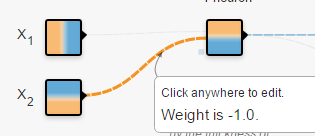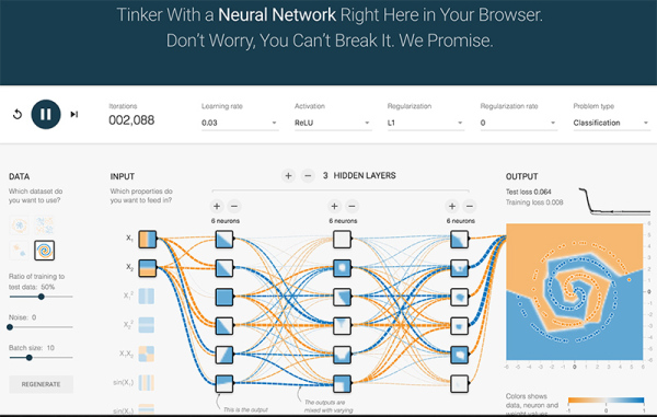 數(shù)據(jù):在二維平面內(nèi),若干點被標記成了兩種顏色。黃色,藍色,表示想要區(qū)分的兩類。你可以把平面內(nèi)的任意點標記成任意顏色。網(wǎng)頁給你提供了4種規(guī)律。神經(jīng)網(wǎng)絡會根據(jù)你給的數(shù)據(jù)訓練,再分類相同規(guī)律的點。輸入:在二維平面內(nèi),你想給網(wǎng)絡多少關(guān)于“點”的信息。從顏色就可以看出來,x_{1}左邊是負,右邊是正,x_{1}表示此點的橫坐標值。同理,x_{2}表示此點的縱坐標值。x_{1}^{2}是關(guān)于橫坐標值的“拋物線”信息。你也可以給更多關(guān)于這個點的信息。給的越多,越容易被分開。連接線:表示權(quán)重,藍色表示用神經(jīng)元的原始輸出,黃色表示用負輸出。深淺表示權(quán)重的絕對值大小。鼠標放在線上可以看到具體值。也可以更改。在(1)中,當把x_{2}輸出的一個權(quán)重改為-1時,x_{2}的形狀直接倒置了。不過還需要考慮激活函數(shù)。(1)中用的是linear。在(2)中,當換成sigmoid時,你會發(fā)現(xiàn)沒有黃色區(qū)域了。因為sigmoid的值域是(0,1)(1)(2)輸出:黃色背景顏色都被歸為黃點類,藍色背景顏色都被歸為藍點類。深淺表示可能性的強弱。上圖中所有在黃色背景顏色的點都會被分類為“黃點“,同理,藍色區(qū)域被分成藍點。在上面的分類分布圖中你可以看到每一層通過上一層信息的組合所形成的。權(quán)重(那些連接線)控制了“如何組合”。神經(jīng)網(wǎng)絡的學習也就是從數(shù)據(jù)中學習那些權(quán)重。Tensorflow playground所表現(xiàn)出來的現(xiàn)象就是“在我文章里所寫的“物質(zhì)組成思想”,這也是為什么我把Tensorflow playground放在了那一部分。不過你要是把Tensorflow的個名字拆開來看的話,是tensor(張量)的flow(流動)。Tensorflow playground的作者想要闡述的側(cè)重點是“張量如何流動”的。5種空間變換的理解:Tensorflow playground下沒有體現(xiàn)5種空間變換的理解。需要打開這個網(wǎng)站嘗試:ConvNetJS demo: Classify toy 2D data左側(cè)是原始輸入空間下的分類圖,右側(cè)是轉(zhuǎn)換后的高維空間下的扭曲圖。最終的扭曲效果是所有綠點都被扭曲到了一側(cè),而所有紅點都被扭曲到了另一側(cè)。這樣就可以線性分割(用超平面(這里是一個平面)在中間分開兩類)深層學習為何要“Deep”(下)