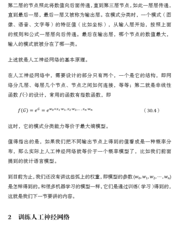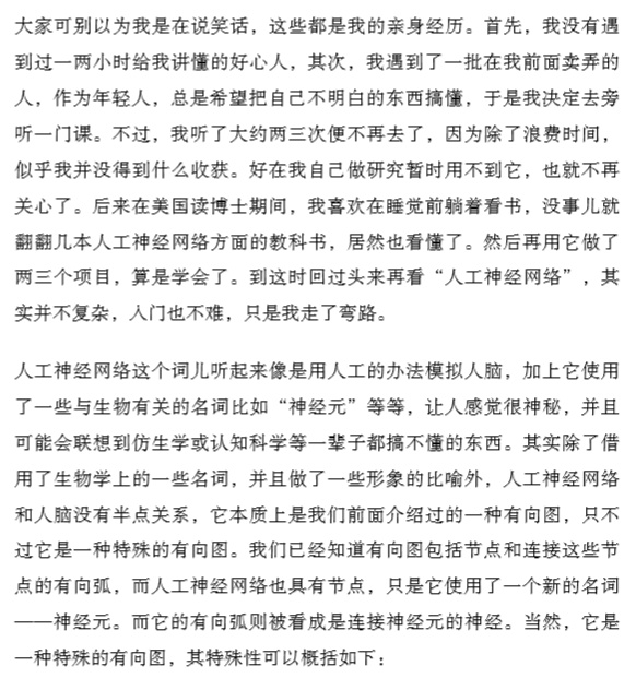 大家可別以為我是在說笑話,這些都是我的親身經(jīng)歷。首先,我沒有遇到過一兩小時給我講懂的好心人,其次我遇到了一批在我前面賣弄的人,作為年輕人,總是希望把自己不明白的東西搞懂,于是我決定去旁聽一門課。不過,我聽了大約兩三次便不再去了,因為除了浪費時間,似乎我并沒得到什么收獲。好在我自己做研究暫時用不到它,也就不再關(guān)心了。后來在美國讀博士期間,我喜歡在睡覺前躺著看書,沒事兒就捧著幾本關(guān)于人工神經(jīng)網(wǎng)絡的教科書在床上看,居然也看懂了。然后再用它做了兩三個項目,算是學會了。到這時回過頭來再看“人工神經(jīng)網(wǎng)絡”,其實并不復雜,入門也不難,只是我走了彎路。——吳軍】