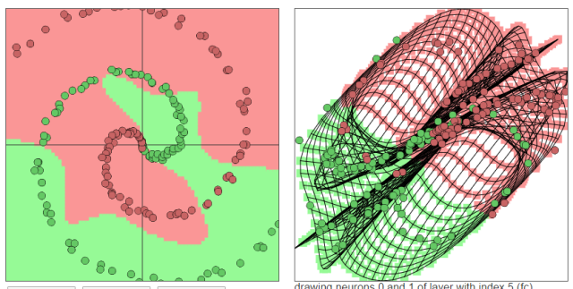 的形狀直接倒置了。不過還需要考慮激活函數。(1)中用的是linear。在(2)中,當換成sigmoid時,你會發現沒有黃色區域了。因為sigmoid的值域是(0,1)(1)(2)輸出:黃色背景顏色都被歸為黃點類,藍色背景顏色都被歸為藍點類。深淺表示可能性的強弱。上圖中所有在黃色背景顏色的點都會被分類為“黃點“,同理,藍色區域被分成藍點。在上面的分類分布圖中你可以看到每一層通過上一層信息的組合所形成的。權重(那些連接線)控制了“如何組合”。神經網絡的學習也就是從數據中學習那些權重。Tensorflow playground所表現出來的現象就是“在我文章里所寫的“物質組成思想”,這也是為什么我把Tensorflow playground放在了那一部分。不過你要是把Tensorflow的個名字拆開來看的話,是tensor(張量)的flow(流動)。Tensorflow playground的作者想要闡述的側重點是“張量如何流動”的。5種空間變換的理解:Tensorflow playground下沒有體現5種空間變換的理解。需要打開這個網站嘗試:ConvNetJS demo: Classify toy 2D data左側是原始輸入空間下的分類圖,右側是轉換后的高維空間下的扭曲圖。最終的扭曲效果是所有綠點都被扭曲到了一側,而所有紅點都被扭曲到了另一側。這樣就可以線性分割(用超平面(這里是一個平面)在中間分開兩類)深層學習為何要“Deep”(下)