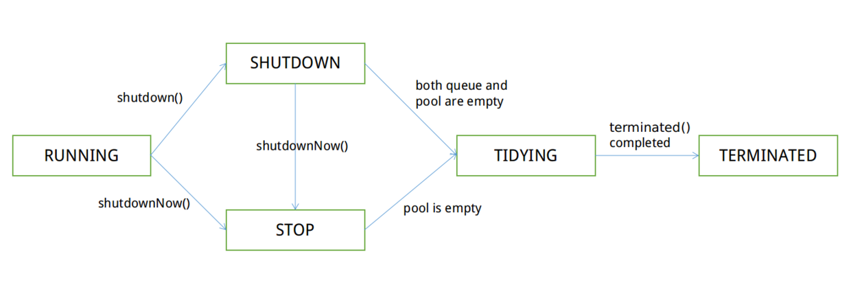 PRivate final AtomicInteger ctl = new AtomicInteger(ctlOf(RUNNING, 0));private static final int COUNT_BITS = Integer.SIZE - 3;private static final int CAPACITY = (1 << COUNT_BITS) - 1;// 線程池狀態(tài)private static final int RUNNING = -1 << COUNT_BITS;private static final int SHUTDOWN = 0 << COUNT_BITS;private static final int STOP = 1 << COUNT_BITS;private static final int TIDYING = 2 << COUNT_BITS;private static final int TERMINATED = 3 << COUNT_BITS;// ctl操作private static int runStateOf(int c) { return c & ~CAPACITY; }private static int workerCountOf(int c) { return c & CAPACITY; }private static int ctlOf(int rs, int wc) { return rs | wc; }RUNNING:可接收新任務(wù),可執(zhí)行等待隊(duì)列里的任務(wù)SHUTDOWN:不可接收新任務(wù),可執(zhí)行等待隊(duì)列里的任務(wù)STOP:不可接收新任務(wù),不可執(zhí)行等待隊(duì)列里的任務(wù),并且嘗試終止所有在運(yùn)行任務(wù)TIDYING:所有任務(wù)已經(jīng)終止,執(zhí)行terminated()TERMINATED:terminated()執(zhí)行完成線程池狀態(tài)默認(rèn)從RUNNING開始流轉(zhuǎn),到狀態(tài)TERMINATED結(jié)束,中間不需要經(jīng)過每一種狀態(tài),但不能讓狀態(tài)回退。下面是狀態(tài)變化可能的路徑和變化條件: