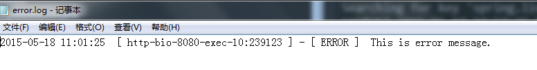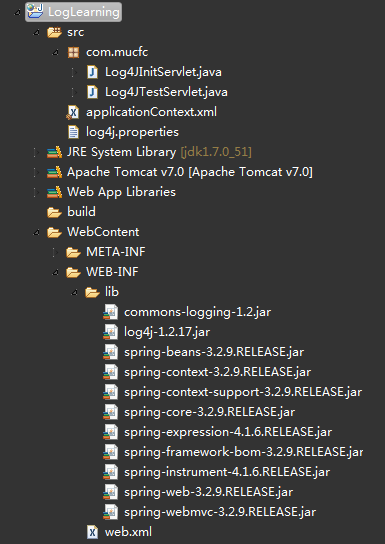 <?xml version="1.0" encoding="UTF-8"?> <web-app xmlns:xsi="http://www.w3.org/2001/XMLSchema-instance" xmlns="http://java.sun.com/xml/ns/javaee" xsi:schemaLocation="http://java.sun.com/xml/ns/javaee http://java.sun.com/xml/ns/javaee/web-app_3_0.xsd" id="WebApp_ID" version="3.0"> <display-name>LogLearning</display-name> <servlet> <servlet-name>Log4JTestServlet</servlet-name> <servlet-class>com.mucfc.Log4JTestServlet</servlet-class> </servlet> <!--用來啟動(dòng) log4jConfigLocation的servlet --> <!-- <servlet> <servlet-name>Log4JInitServlet</servlet-name> <servlet-class>com.mucfc.Log4JInitServlet</servlet-class> <init-param> <param-name>log4j-properties-location</param-name> <param-value>/WEB-INF/classes/log4j.properties</param-value> </init-param> <load-on-startup>1</load-on-startup> </servlet>--> <servlet-mapping> <servlet-name>Log4JTestServlet</servlet-name> <url-pattern>/test</url-pattern> </servlet-mapping> <!-- Spring 容器加載 --> <listener> <listener-class>org.springframework.web.context.ContextLoaderListener</listener-class> </listener> <context-param> <param-name>contextConfigLocation</param-name> <param-value>classpath:applicationContext.xml</param-value> </context-param> <!-- 設(shè)置根目錄 --> <context-param> <param-name>webAppRootKey</param-name> <param-value>webapp.root</param-value> </context-param> <context-param> <param-name>log4jConfigLocation</param-name> <param-value>/WEB-INF/classes/log4j.properties</param-value> </context-param> <!-- 3000表示 開一條watchdog線程每60秒掃描一下配置文件的變化;這樣便于日志存放位置的改變 --> <context-param> <param-name>log4jRefreshInterval</param-name> <param-value>3000</param-value> </context-param> <listener> <listener-class>org.springframework.web.util.Log4jConfigListener</listener-class> </listener> </web-app>這里L(fēng)og4JInitServlet.java就相當(dāng)于沒用到了。