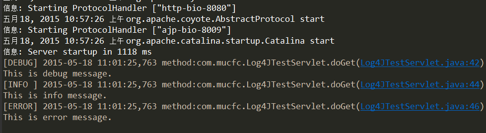 package com.mucfc; import java.io.IOException; import javax.servlet.ServletConfig; import javax.servlet.ServletException; import javax.servlet.annotation.WebServlet; import javax.servlet.http.HttpServlet; import javax.servlet.http.HttpServletRequest; import javax.servlet.http.HttpServletResponse; import org.apache.log4j.Logger; /** * Servlet implementation class Log4JTestServlet */ @WebServlet("/Log4JTestServlet") public class Log4JTestServlet extends HttpServlet { private static final long serialVersionUID = 1L; private static Logger logger = Logger.getLogger(Log4JTestServlet.class); /** * @see HttpServlet#HttpServlet() */ public Log4JTestServlet() { super(); // TODO Auto-generated constructor stub } /** * @see Servlet#init(ServletConfig) */ public void init(ServletConfig config) throws ServletException { // TODO Auto-generated method stub } /** * @see HttpServlet#doGet(HttpServletRequest request, HttpServletResponse response) */ protected void doGet(HttpServletRequest request, HttpServletResponse response) throws ServletException, IOException { // 記錄debug級(jí)別的信息 logger.debug("This is debug message."); // 記錄info級(jí)別的信息 logger.info("This is info message."); // 記錄error級(jí)別的信息 logger.error("This is error message."); } /** * @see HttpServlet#doPost(HttpServletRequest request, HttpServletResponse response) */ protected void doPost(HttpServletRequest request, HttpServletResponse response) throws ServletException, IOException { doGet(request,response); } }接下來就是運(yùn)行了,來看看結(jié)果: