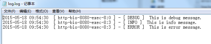 ### 設(shè)置###log4j.rootLogger = debug,stdout,D,E### 輸出信息到控制抬 ###log4j.appender.stdout = org.apache.log4j.ConsoleAppenderlog4j.appender.stdout.Target = System.outlog4j.appender.stdout.layout = org.apache.log4j.PatternLayoutlog4j.appender.stdout.layout.ConversionPattern = [%-5p] %d{yyyy-MM-dd HH:mm:ss,SSS} method:%l%n%m%n### 輸出DEBUG 級(jí)別以上的日志到=E://logs/error.log ###log4j.appender.D = org.apache.log4j.DailyRollingFileAppenderlog4j.appender.D.File = E://logs/log.loglog4j.appender.D.Append = truelog4j.appender.D.Threshold = DEBUG log4j.appender.D.layout = org.apache.log4j.PatternLayoutlog4j.appender.D.layout.ConversionPattern = %-d{yyyy-MM-dd HH:mm:ss} [ %t:%r ] - [ %p ] %m%n### 輸出ERROR 級(jí)別以上的日志到=E://logs/error.log ###log4j.appender.E = org.apache.log4j.DailyRollingFileAppenderlog4j.appender.E.File =E://logs/error.log log4j.appender.E.Append = truelog4j.appender.E.Threshold = ERROR log4j.appender.E.layout = org.apache.log4j.PatternLayoutlog4j.appender.E.layout.ConversionPattern = %-d{yyyy-MM-dd HH:mm:ss} [ %t:%r ] - [ %p ] %m%n3、設(shè)置日志內(nèi)容