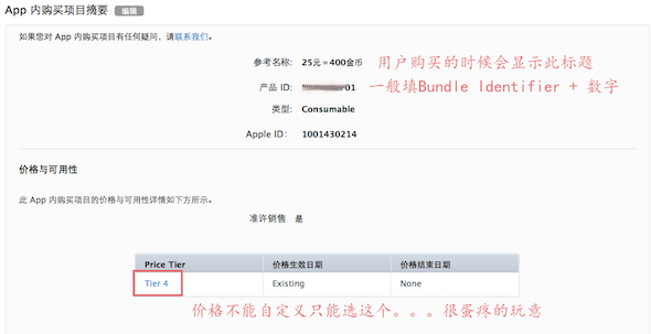 .h文件#import <StoreKit/StoreKit.h>enum{IAP0p20=20,IAP1p100,IAP4p600,IAP9p1000,IAP24p6000,}buyCoinsTag;//代理@interface RechargeVC : UIViewController <SKPaymentTransactionObserver,SKPRoductsRequestDelegate >{int buyType;}- (void) requestProUpgradeProductData;-(void)RequestProductData;-(void)buy:(int)type;- (void)paymentQueue:(SKPaymentQueue *)queue updatedTransactions:(NSArray *)transactions;-(void) PurchasedTransaction: (SKPaymentTransaction *)transaction;- (void) completeTransaction: (SKPaymentTransaction *)transaction;- (void) failedTransaction: (SKPaymentTransaction *)transaction;-(void) paymentQueueRestoreCompletedTransactionsFinished: (SKPaymentTransaction *)transaction;-(void) paymentQueue:(SKPaymentQueue *) paymentQueue restoreCompletedTransactionsFailedWithError:(NSError *)error;- (void) restoreTransaction: (SKPaymentTransaction *)transaction;-(void)provideContent:(NSString *)product;-(void)recordTransaction:(NSString *)product;@end.m文件#import "RechargeVC.h"//在內(nèi)購項(xiàng)目中創(chuàng)的商品單號#define ProductID_IAP0p20 @"Nada.JPYF01"http://20#define ProductID_IAP1p100 @"Nada.JPYF02" //100#define ProductID_IAP4p600 @"Nada.JPYF03" //600#define ProductID_IAP9p1000 @"Nada.JPYF04" //1000#define ProductID_IAP24p6000 @"Nada.JPYF05" //6000@interface RechargeVC ()@end@implementation RechargeVC- (void)viewDidLoad { [super viewDidLoad]; [[SKPaymentQueue defaultQueue] addTransactionObserver:self]; [self buy:IAP0p20];}-(void)buy:(int)type{ buyType = type; if ([SKPaymentQueue canMakePayments]) { [self RequestProductData]; NSLog(@"允許程序內(nèi)付費(fèi)購買");}else{ NSLog(@"不允許程序內(nèi)付費(fèi)購買"); UIAlertView *alerView = [[UIAlertView alloc] initWithTitle:@"提示" message:@"您的手機(jī)沒有打開程序內(nèi)付費(fèi)購買" delegate:nil cancelButtonTitle:NSLocalizedString(@"關(guān)閉",nil) otherButtonTitles:nil]; [alerView show]; }}-(void)RequestProductData{ NSLog(@"---------請求對應(yīng)的產(chǎn)品信息------------"); NSArray *product = nil; switch (buyType) { case IAP0p20: product=[[NSArray alloc] initWithObjects:ProductID_IAP0p20,nil]; break; case IAP1p100: product=[[NSArray alloc] initWithObjects:ProductID_IAP1p100,nil]; break; case IAP4p600: product=[[NSArray alloc] initWithObjects:ProductID_IAP4p600,nil]; break; case IAP9p1000: product=[[NSArray alloc] initWithObjects:ProductID_IAP9p1000,nil]; break; case IAP24p6000: product=[[NSArray alloc] initWithObjects:ProductID_IAP24p6000,nil]; break; default: break;} NSSet *nsset = [NSSet setWithArray:product]; SKProductsRequest *request=[[SKProductsRequest alloc] initWithProductIdentifiers: nsset]; request.delegate=self; [request start];}//<SKProductsRequestDelegate> 請求協(xié)議//收到的產(chǎn)品信息- (void)productsRequest:(SKProductsRequest *)request didReceiveResponse:(SKProductsResponse *)response{ NSLog(@"-----------收到產(chǎn)品反饋信息--------------"); NSArray *myProduct = response.products; NSLog(@"產(chǎn)品Product ID:%@",response.invalidProductIdentifiers); NSLog(@"產(chǎn)品付費(fèi)數(shù)量: %d", (int)[myProduct count]); // populate UI for(SKProduct *product in myProduct){ NSLog(@"product info"); NSLog(@"SKProduct 描述信息%@", [product description]); NSLog(@"產(chǎn)品標(biāo)題 %@" , product.localizedTitle); NSLog(@"產(chǎn)品描述信息: %@" , product.localizedDescription); NSLog(@"價格: %@" , product.price); NSLog(@"Product id: %@" , product.productIdentifier);} SKPayment *payment = nil; switch (buyType) { case IAP0p20: payment = [SKPayment paymentWithProductIdentifier:ProductID_IAP0p20]; //支付25 break; case IAP1p100: payment = [SKPayment paymentWithProductIdentifier:ProductID_IAP1p100]; //支付108 break; case IAP4p600: payment = [SKPayment paymentWithProductIdentifier:ProductID_IAP4p600]; //支付618 break; case IAP9p1000: payment = [SKPayment paymentWithProductIdentifier:ProductID_IAP9p1000]; //支付1048 break; case IAP24p6000: payment = [SKPayment paymentWithProductIdentifier:ProductID_IAP24p6000]; //支付5898 break; default: break;} NSLog(@"---------發(fā)送購買請求------------"); [[SKPaymentQueue defaultQueue] addPayment:payment];}- (void)requestProUpgradeProductData{ NSLog(@"------請求升級數(shù)據(jù)---------"); NSSet *productIdentifiers = [NSSet setWithObject:@"com.productid"]; SKProductsRequest* productsRequest = [[SKProductsRequest alloc] initWithProductIdentifiers:productIdentifiers]; productsRequest.delegate = self; [productsRequest start];}//彈出錯誤信息- (void)request:(SKRequest *)request didFailWithError:(NSError *)error{ NSLog(@"-------彈出錯誤信息----------"); UIAlertView *alerView = [[UIAlertView alloc] initWithTitle:NSLocalizedString(@"Alert",NULL) message:[error localizedDescription] delegate:nil cancelButtonTitle:NSLocalizedString(@"Close",nil) otherButtonTitles:nil]; [alerView show];}-(void) requestDidFinish:(SKRequest *)request{ NSLog(@"----------反饋信息結(jié)束--------------");}-(void) PurchasedTransaction: (SKPaymentTransaction *)transaction{ NSLog(@"-----PurchasedTransaction----"); NSArray *transactions =[[NSArray alloc] initWithObjects:transaction, nil]; [self paymentQueue:[SKPaymentQueue defaultQueue] updatedTransactions:transactions];}//<SKPaymentTransactionObserver> 千萬不要忘記綁定,代碼如下://----監(jiān)聽購買結(jié)果//[[SKPaymentQueue defaultQueue] addTransactionObserver:self];- (void)paymentQueue:(SKPaymentQueue *)queue updatedTransactions:(NSArray *)transactions//交易結(jié)果{ NSLog(@"-----paymentQueue--------"); for (SKPaymentTransaction *transaction in transactions) { switch (transaction.transactionState) { case SKPaymentTransactionStatePurchased:{//交易完成 [self completeTransaction:transaction]; NSLog(@"-----交易完成 --------"); UIAlertView *alerView = [[UIAlertView alloc] initWithTitle:@"" message:@"購買成功" delegate:nil cancelButtonTitle:NSLocalizedString(@"關(g