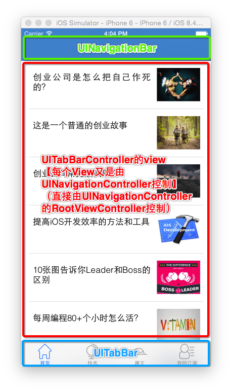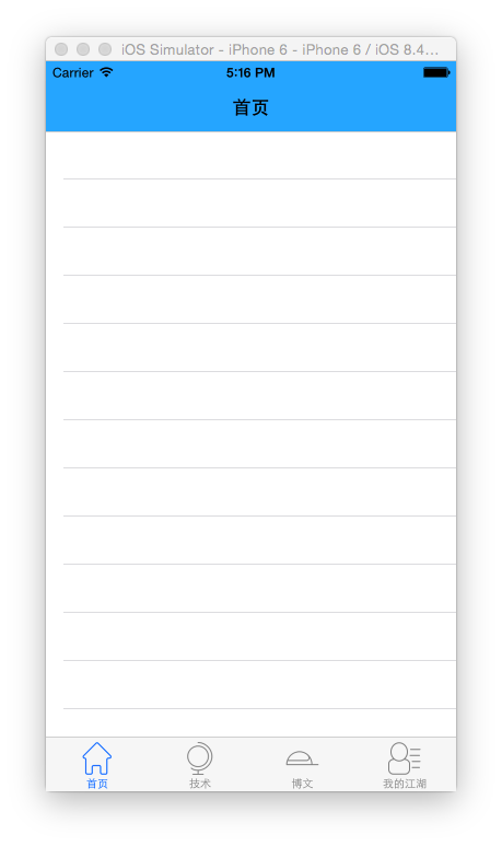 - (void)viewDidLoad { [super viewDidLoad]; // 1.添加第一個控制器 // 1.1 初始化 CYXOneViewController *oneVC = [[CYXOneViewController alloc]init]; // 1.2 把oneVC添加為UINavigationController的根控制器 UINavigationController *nav1 = [[UINavigationController alloc]initWithRootViewController:oneVC]; // 設置tabBar的標題 nav1.title = @"首頁"; [nav1.navigationBar setBackgroundImage:[UIImage imageNamed:@"commentary_num_bg"] forBarMetrics:UIBarMetricsDefault]; // 設置tabBar的圖標 nav1.tabBarItem.image = [UIImage imageNamed:@"tab_home_icon"]; // 設置navigationBar的標題 oneVC.navigationItem.title = @"首頁"; // 設置背景色(這些操作可以交給每個單獨子控制器去做) oneVC.view.backgroundColor = [UIColor whiteColor]; // 1.3 把UINavigationController交給UITabBarController管理 [self addChildViewController:nav1]; // 2.添加第2個控制器 CYXTwoViewController *twoVC = [[CYXTwoViewController alloc]init]; UINavigationController *nav2 = [[UINavigationController alloc]initWithRootViewController:twoVC]; nav2.title = @"技術"; nav2.tabBarItem.image = [UIImage imageNamed:@"js"]; twoVC.navigationItem.title = @"技術"; twoVC.view.backgroundColor = [UIColor blueColor]; [self addChildViewController:nav2]; // 3.添加第3個控制器 CYXThreeViewController *threeVC = [[CYXThreeViewController alloc]init]; UINavigationController *nav3 = [[UINavigationController alloc]initWithRootViewController:threeVC]; nav3.title = @"博文"; nav3.tabBarItem.image = [UIImage imageNamed:@"qw"]; threeVC.navigationItem.title = @"博文"; threeVC.view.backgroundColor = [UIColor yellowColor]; [self addChildViewController:nav3]; // 4.添加第4個控制器 CYXFourViewController *fourVC = [[CYXFourViewController alloc]init]; UINavigationController *nav4 = [[UINavigationController alloc]initWithRootViewController:fourVC]; nav4.title = @"我的江湖"; nav4.tabBarItem.image = [UIImage imageNamed:@"user"]; fourVC.navigationItem.title = @"我的江湖"; fourVC.view.backgroundColor = [UIColor grayColor]; [self addChildViewController:nav4];}