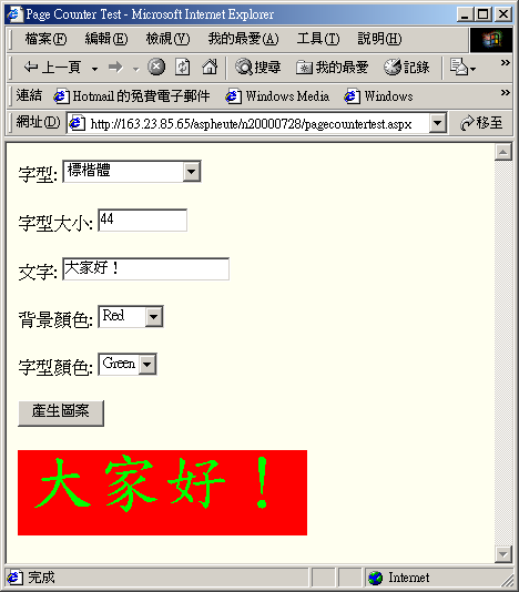 這個 ASP.NET page (pagecountertest.aspx) 更棒的是我可以在同一個網頁獲得圖案。這個 form 的 原始碼 已經包含許多 server 端的 ASP.NET 控制項 (controls)。 這意味著可作為將來文章中的開胃菜,在 ASP.NET 架構中對於 form 的處理以及驗證,會有詳盡說明。