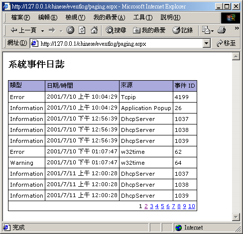 在 ASP.NET 中有許多的創(chuàng)新,特別是在資料的展示,而且更棒的是資料並不一定要來自資料庫中。對(duì) DataGrid Web Control 也是如此,也就如其名稱一樣,從資料中產(chǎn)生 table (grid)。唯一需求視資料來源必須是支援 ICollection 介面 ─ 也就是使用 EventLog 的集合 Entries。
