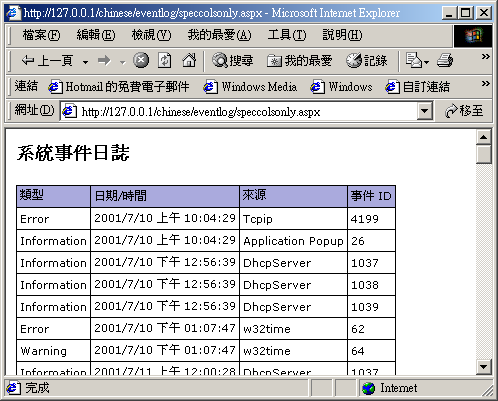 在 Windows 2000 (或 NT) 的事件日誌對(duì)管理者來說可說是最重要的訊息來源,因?yàn)樗械陌l(fā)生的事件都會(huì)紀(jì)錄在那裡 ─ 從成功到嚴(yán)重性的失敗。由於是如此的重要,那麼要是能夠透過 web 來使用,可不是更能突顯嗎?