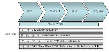 移動支付與普通的支付不同之處,在于交易資格審查處理過程有所不同。因為這些都涉及到移動網絡運營商以及所使用的瀏覽協議,例如WAP或HTML、信息系統SMS或USSD(Unstructured Supplementary Service Data)等。下圖可以更好的解釋移動支付的建立過程以及涉及到的移動架構。
