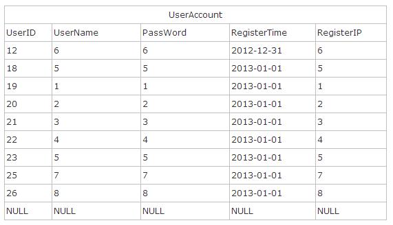結果:相當于運行 insert into UserAccount (UserName,[PassWord],RegisterTime,RegisterIP) values(9,9,'2013-01-02',9) 這行代碼。