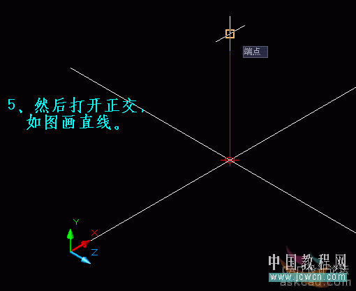 7、比如畫這條直線,當畫了第一點后,系統(tǒng)要求指定下一點時,就在命令行輸入“XY”,注意XY之前有個小數(shù)點,然后捕捉圖中十字交叉點,這時命令行提示“于(需要Z)”,這時在后面輸入直線的長度。