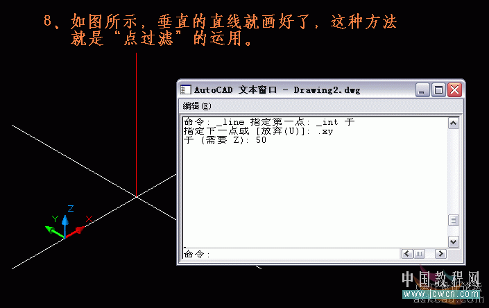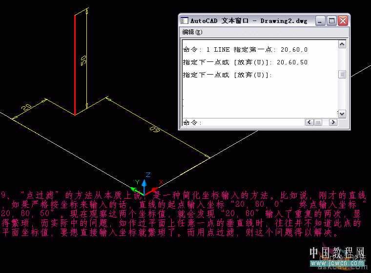 9、“點過濾”的方法從本質(zhì)上說,是一種簡化坐標輸入的方法。比如說,剛才的直線,如果嚴格按坐標來輸入的話,直線的起點輸入坐標“20、60、0”輸入了重復(fù)的兩次,顯得繁瑣,而實際中的問題,如作過平面上任意一點的垂直線時,往往并不知道此點的平面坐標值,要想直接輸入坐標就繁瑣了。而用點過濾,則這個問題得以解決。