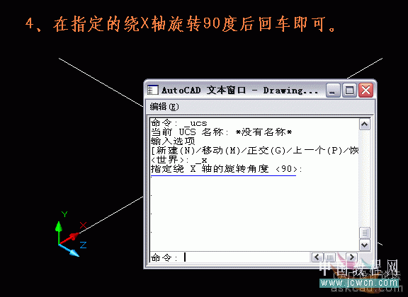 4、在指定的繞X軸旋轉(zhuǎn)90度后回車即可。