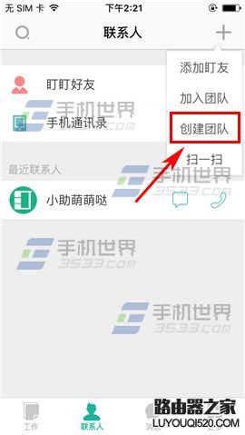 1)點開盯盯,首先點擊主頁中的【聯系人】,隨后點擊界面右上角處的“+”并選擇【創建團隊】;(如下圖)