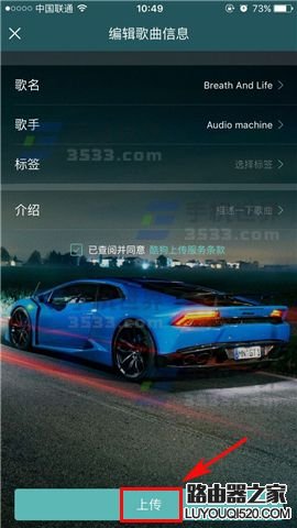 3)選擇你喜歡的歌曲,,編輯好信息后勾選同意即可點(diǎn)擊下方的【上傳】按鈕進(jìn)行長(zhǎng)傳至網(wǎng)上。(如下圖)