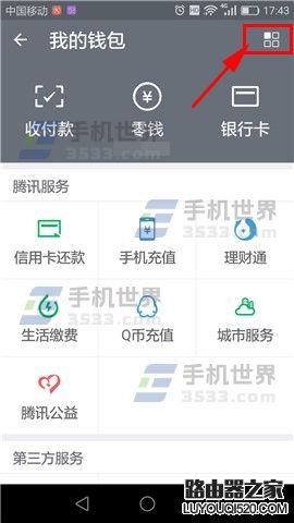 1)打開微信應用,點擊右下角【我】頁面中的【錢包】,然后點擊右上角中的【四個方框符號】;(如下圖)