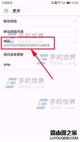 1)打開手機【設置】按鈕,選擇【更多】選項;在【NFC】界面中,選擇“允許在手機接觸其他設備時交換數據”這一欄;(如下圖)