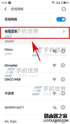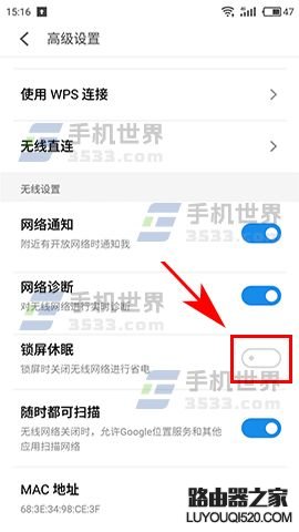 2)接著點(diǎn)擊【高級(jí)設(shè)置】,進(jìn)入高級(jí)設(shè)置界面后再把【鎖屏休眠】選項(xiàng)關(guān)閉,這樣鎖屏的時(shí)候就不會(huì)斷網(wǎng)了。(如下圖)