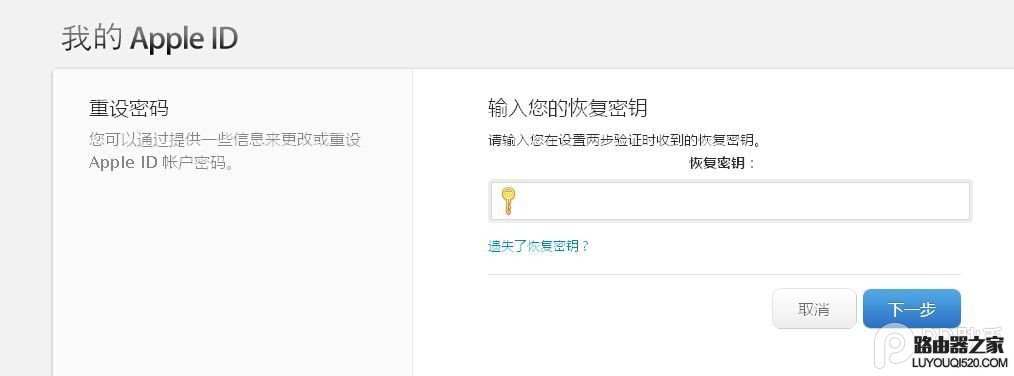 注意,完成這一步之后,我們將成功開啟兩步認證。那么,這個兩步認證應該如何使用呢?開啟兩步認證之后,我們需要輸入驗證碼才能對 iCloud 等內容進行操作。而如果你想要修改 Apple ID 的密碼,則需要輸入上面獲得的恢復密鑰,如下圖所示。