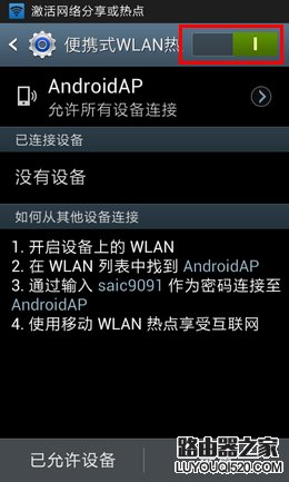 6. 點擊【便攜式WLAN熱點】選項右側的長方形滑塊,顯示綠色代表已開啟;
