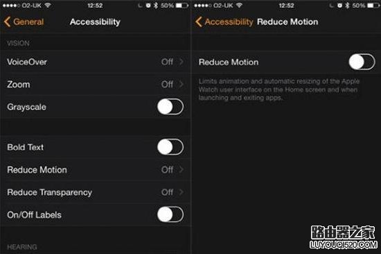 與iPhone一樣,我們可以關閉Apple Watch的動畫效果來節電。在iPhone端的Apple Watch應用中,可以在“通用”-“輔助”項目中找到“減少動畫效果”的選項。