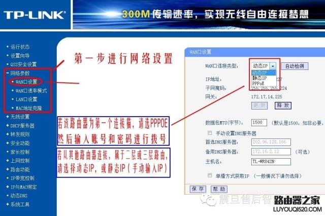 首先進(jìn)行網(wǎng)絡(luò)設(shè)置,若該路由器為第一個(gè)連接貓,請(qǐng)選擇pppoe然后輸入賬號(hào)和密碼進(jìn)行撥號(hào),若從其他路由器連接,屬于二層或三層路由,請(qǐng)選擇動(dòng)態(tài)ip,或靜態(tài)ip(手動(dòng)輸入ip)。