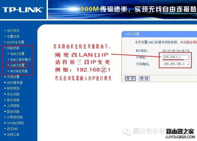 若本路由系連接在其他路由下,須更改LAN口ip,請(qǐng)將第三段ip變更,例如:把192.168.1.1改為192.168.2.1,然后在瀏覽器中輸入該ip進(jìn)行操作