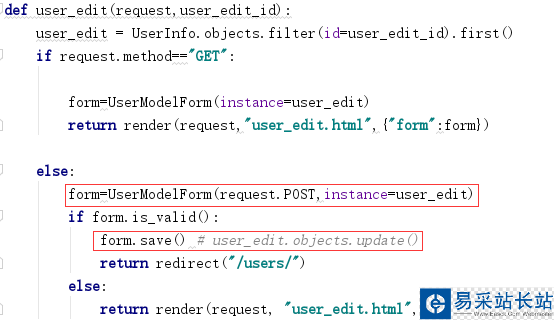 form.save #將數(shù)據(jù)保存至數(shù)據(jù)庫中(如果有instance參數(shù)就修改數(shù)據(jù)庫中的記錄,如果沒有instance參數(shù)就在數(shù)據(jù)庫中添加新的一條記錄)