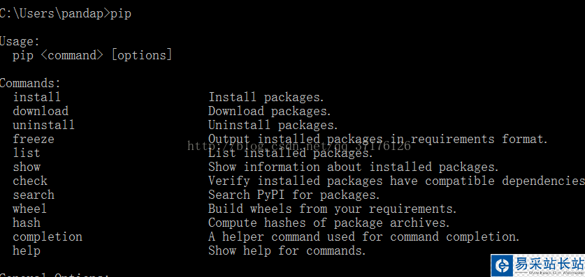 在cmd 下輸入 pip 若顯示 如圖 相關信息,表示安裝成功
