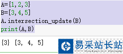 A={1,2,3}B=[3,4,5]A.intersection_update(B)print(A,B)