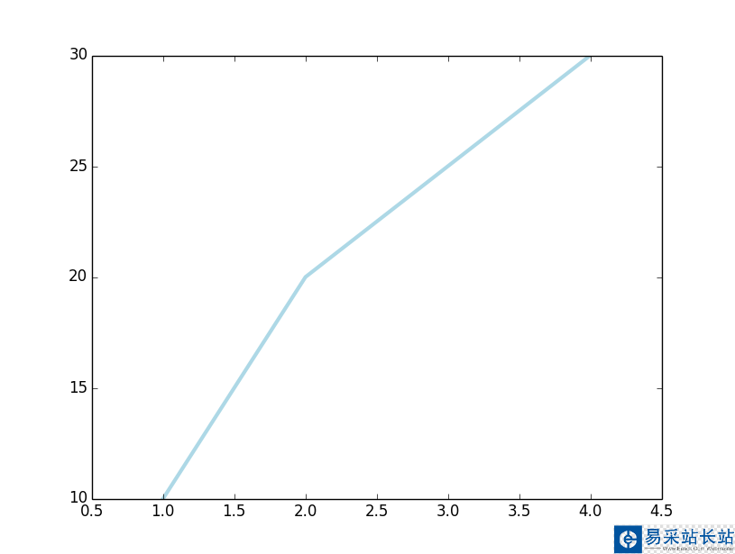 import matplotlib.pyplot as pltplt.plot([1, 2, 3, 4], [10, 20, 25, 30], color='lightblue', linewidth=3)plt.xlim(0.5, 4.5)plt.show()