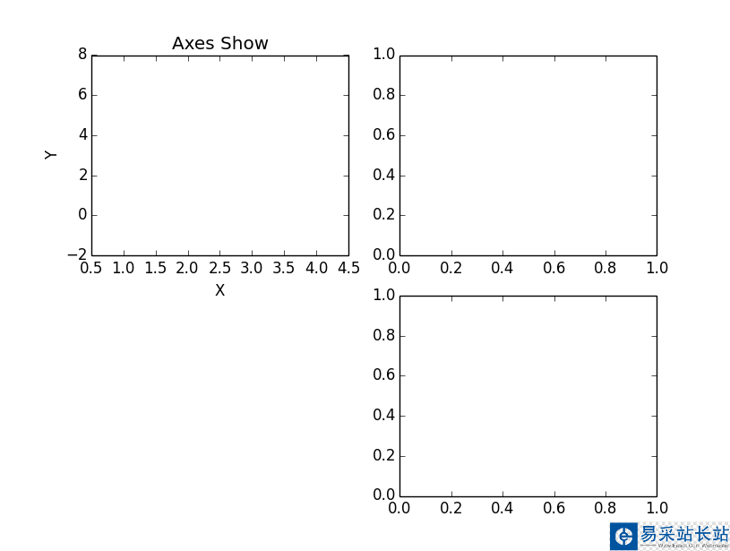 import matplotlib.pyplot as pltfig = plt.figure()ax1 = fig.add_subplot(221)ax2 = fig.add_subplot(222)ax3 = fig.add_subplot(224)ax1.set(xlim=[0.5, 4.5], ylim=[-2, 8], title='Axes Show', ylabel='Y', xlabel='X')plt.show()