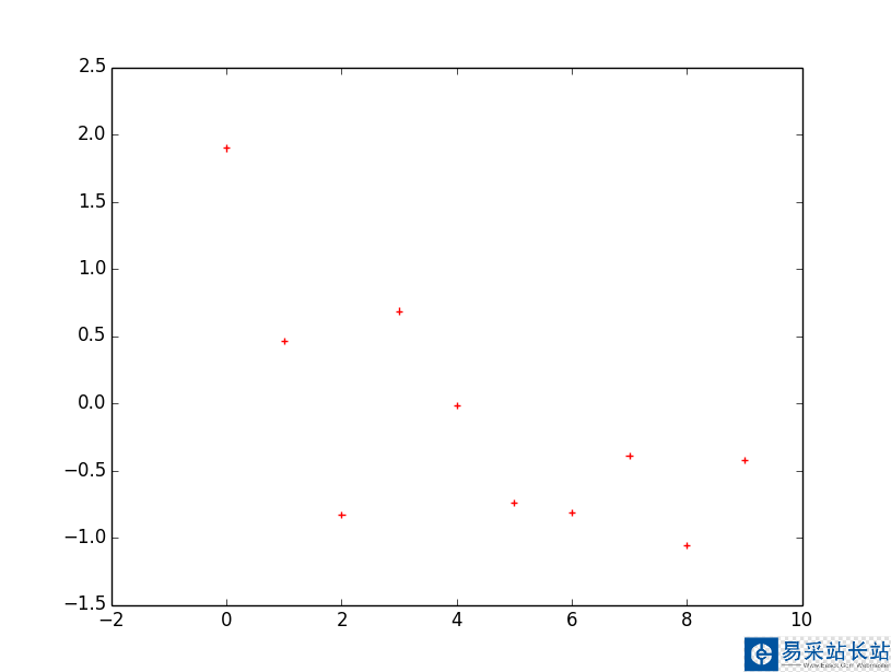 mport matplotlib.pyplot as pltimport numpy as npx = np.arange(10)y = np.random.randn(10)print(y)plt.scatter(x, y, color='red', marker='+')plt.show()
