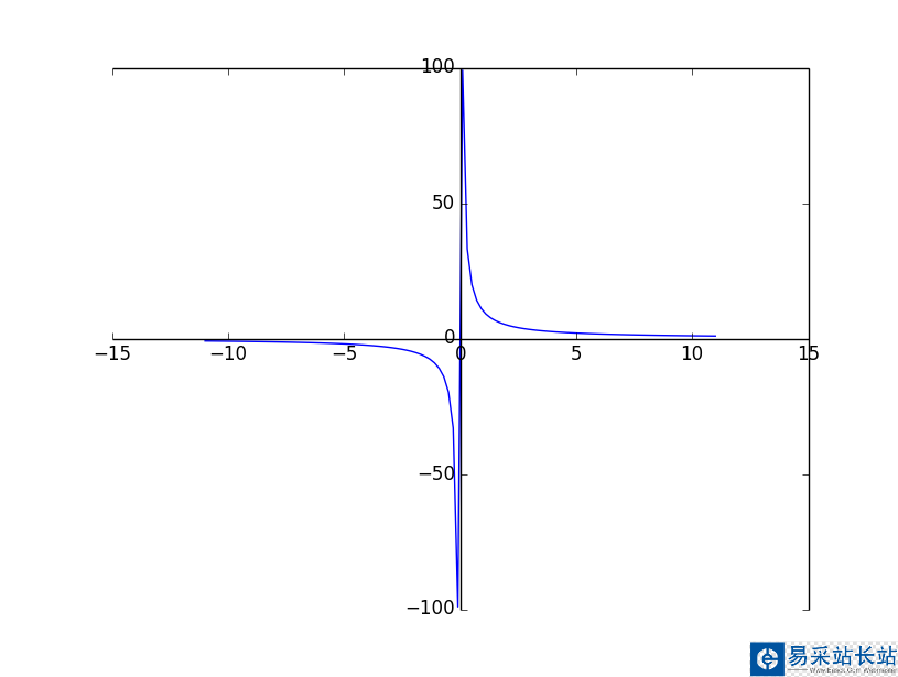 import matplotlib.pyplot as pltimport numpy as npx = np.linspace(-11, 11, 110)print(x)y =10/xplt.plot(x, y)ax = plt.gca()ax.spines['bottom'].set_position(('data',0))ax.spines['left'].set_position(('data',0))plt.show()