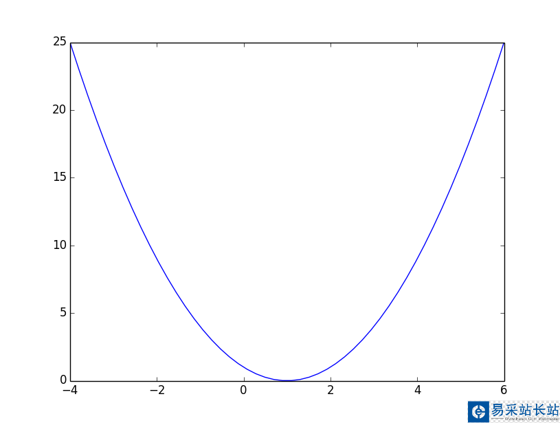 import matplotlib.pyplot as pltimport numpy as npx = np.linspace(-4, 6, 50)print(type(x))print(x)y = x**2 - x*2+1plt.plot(x, y)plt.show()