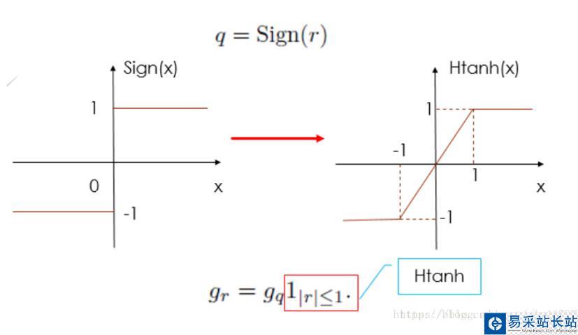 符號函數的前向傳播采用的是階躍函數y=sign(x) y = /rm{sign}(x)y=sign(x),如下圖所示,我們知道階躍函數不是連續可導的,因此我們在反向傳播時,將其替代為一個可以連續求導的函數y=Htanh(x) y = /rm{Htanh(x)}y=Htanh(x),于是梯度就是大于1和小于-1時為0,在-1和1之間時是1。