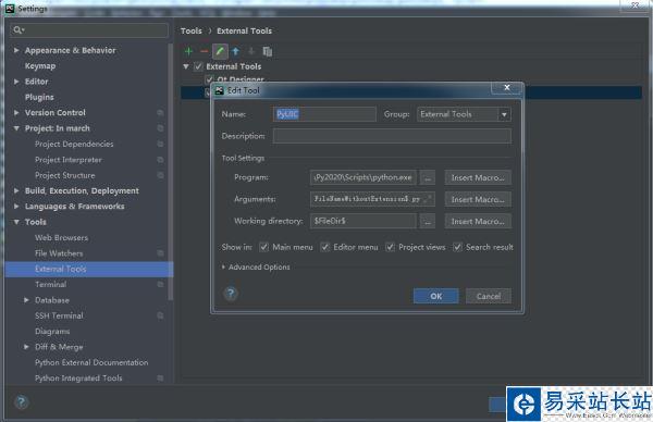 配置好Qt Designer的快捷工具后,根據同樣的方法,添加將QT生成的ui文件轉換為py文件的快捷工具,在Name所對應的編輯框中填寫工具名稱為PyUIC,然后在Program所對應的編輯框中填寫Python的安裝路徑,再在Arguments所對應的編輯框中填寫將ui文件轉換為py文件的Python代碼(-m PyQt5.uic.pyuic $FileName$ -o $FileNameWithoutExtension$.py),在Working directory所對應的編輯框中填寫$FileDir$,該值為文件目錄,單擊OK按鈕即可,如下圖所示(注意:在Program所對應的編輯框中填寫自己的Python安裝路徑,記得尾部需要填寫python.exe),如下圖所示: