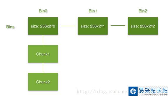 圖中每一列表示一個bin,列首方格中的數字表示bin的size。bin size的大小都是256的2^n的倍。每個bin下面掛載了一系列的空閑chunk,每個chunk的chunk size都大于等于所屬的bin的bin size,按照chunk size的升序掛載成單鏈表。