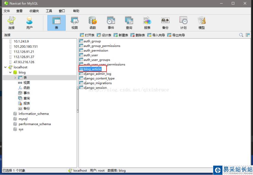 數據表生成成功后,可以看到blog庫中有一個blog_article的表,代表生成數據表成功。