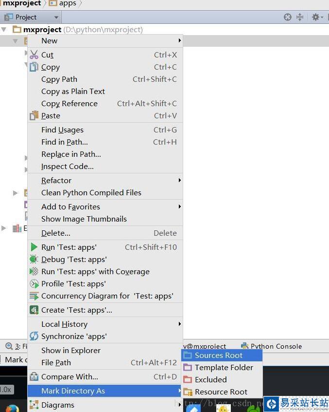這時候需要對apps的文件夾右擊–選擇mark directory as—-選擇sources root,再點擊run,就可以正常運行了