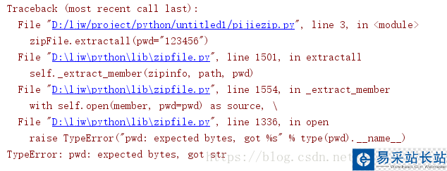 這段代碼其實就是拿著密碼去解壓我們剛剛壓縮的文件,網上大多數教程都是這樣寫的,但是我這邊使用python3.6就會發現運行的時候報錯了