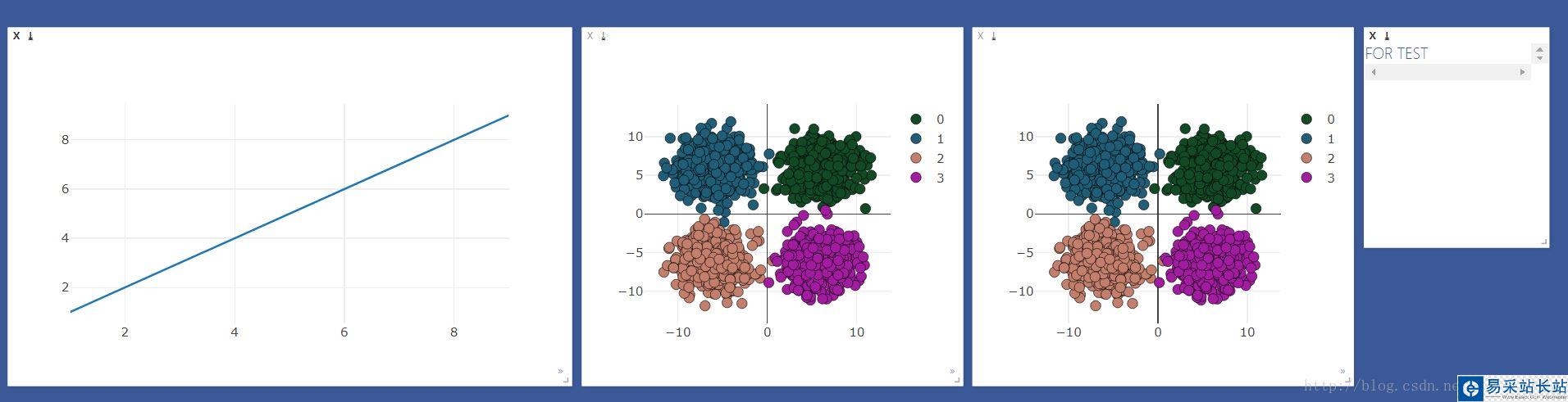 viz = visdom.Visdom()colors = np.random.randint(0,255,(4,3)) #顏色隨機#線圖用來觀察loss 和 accuracyline = viz.line(X=np.arange(1,10,1), Y=np.arange(1,10,1))#散點圖用來觀察分類變化scatter = viz.scatter( X=x, Y=y+1, opts=dict( markercolor = colors, marksize = 5, legend=["0","1","2","3"]),)#text 窗口用來顯示loss 、accuracy 、時間text = viz.text("FOR TEST")#散點圖做對比viz.scatter( X=x, Y=y+1, opts=dict( markercolor = colors, marksize = 5, legend=["0","1","2","3"] ),)