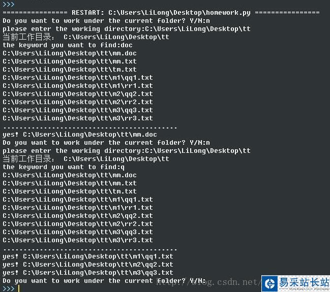 注意:在運行的時候如果選擇y,也就是把.py文件所在的目錄作為工作目錄,此時最好不要把.py文件放到桌面上,因為會遍歷桌面上的所有目錄及目錄下的所有文件,會很大。